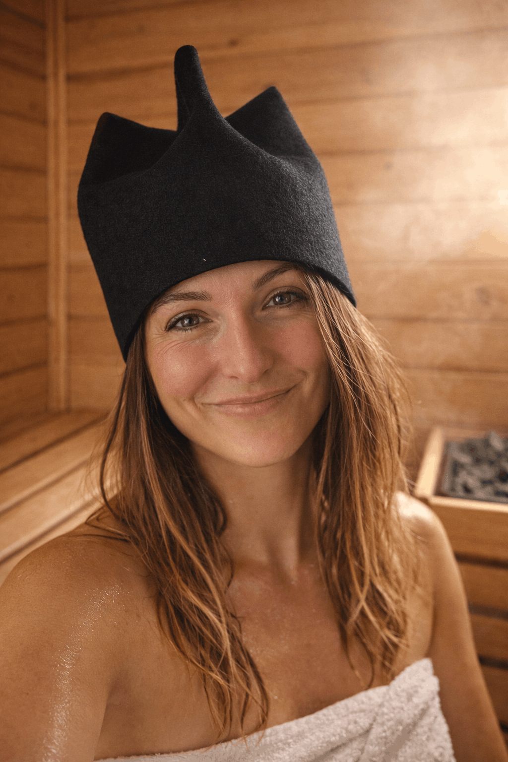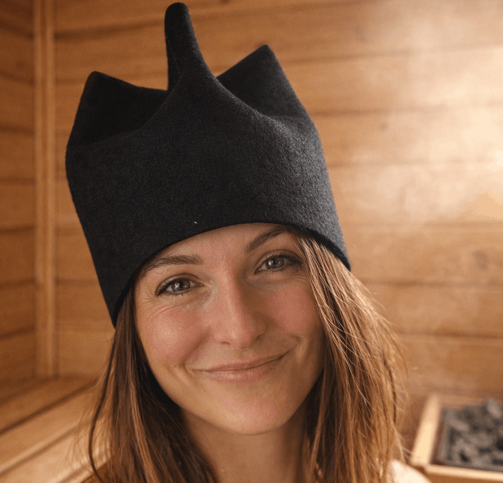 **Filcowy kapelusz chroni mózg i skórę głowy przed przegrzaniem**, pozwalając dłużej i bezpieczniej korzystać z sauny.